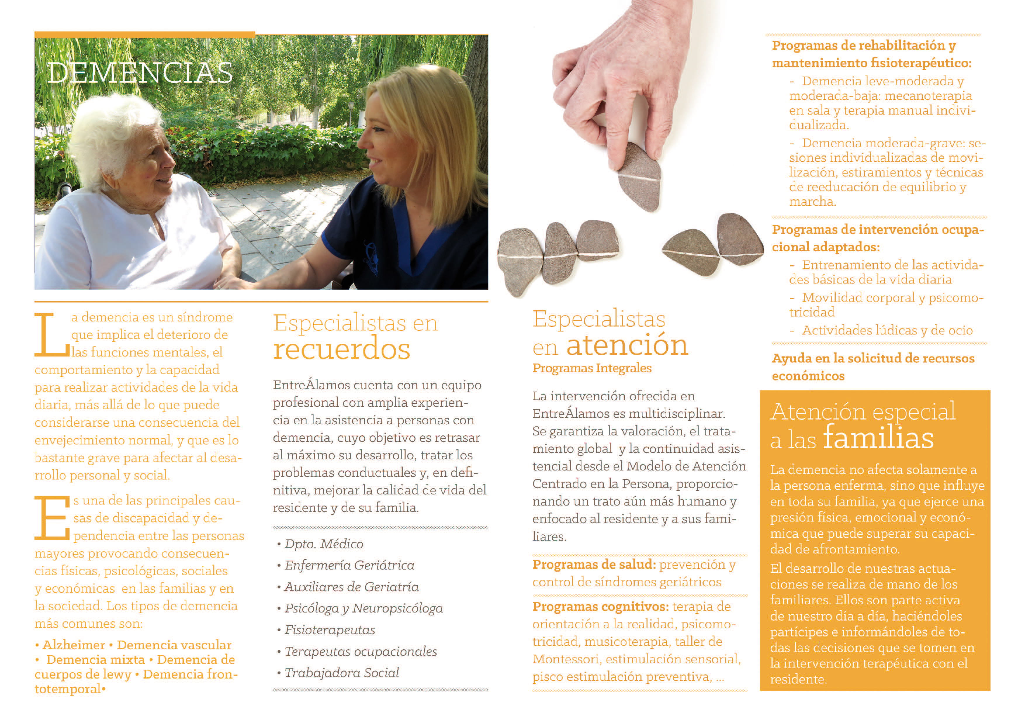 Entreálamos cuenta con un equipo profesional con amplia experiencia en la asistencia a personas con demencia, cuyo objetivo es retrasar al máximo su desarrollo, tratar los problemas conductuales y, en definitiva, mejorar la calidad de vida del residente y de su familia.