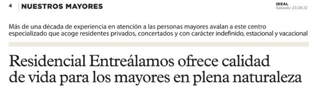 El pasado 23 de Junio (2012) el diario IDEAL de Granada publicó un artículo sobre nuestro Centro Residencial en su edición del sábado. Destacaron la calidad de vida que ofrecemos a los mayores en EntreÁlamos, rodeados de naturaleza y apoyados en la dilatada experiencia de nuestros profesionales.