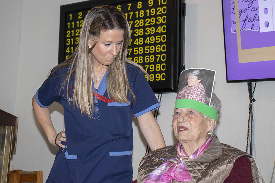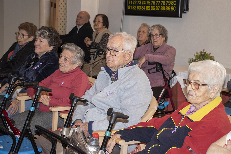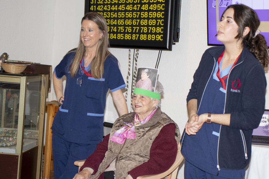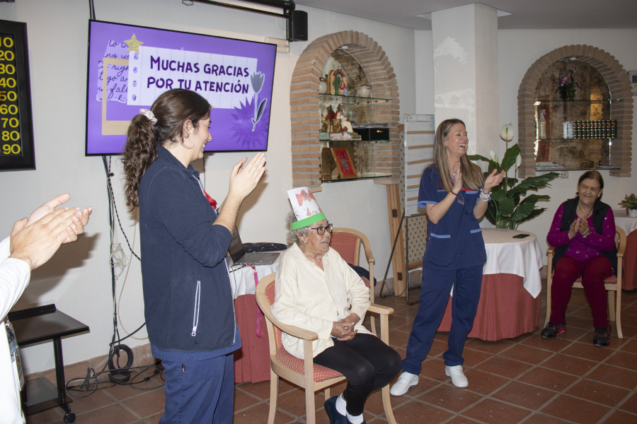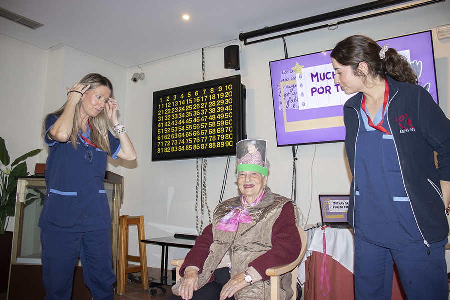 En esta ocasión, el juego tuvo una variante muy especial. En lugar de elegir personajes conocidos de la historia de la mujer, el equipo de Terapia escogió fotografías de algunas de nuestras propias residentes. El resultado fue tan divertido como entrañable: tenían que descubrir el nombre de otra compañera del centro. Hubo muchas risas, sorpresas y momentos muy simpáticos, y además sirvió para que se conozcan un poco más entre ellas.