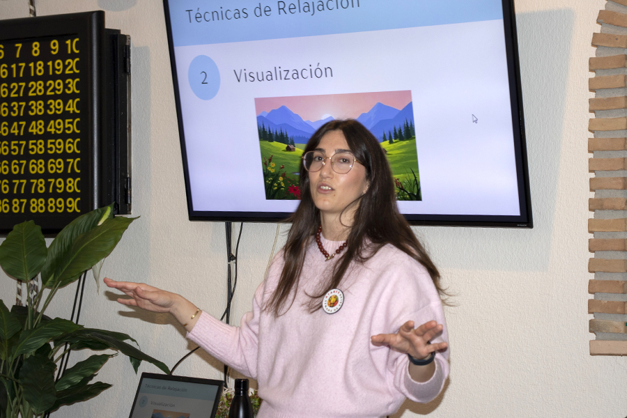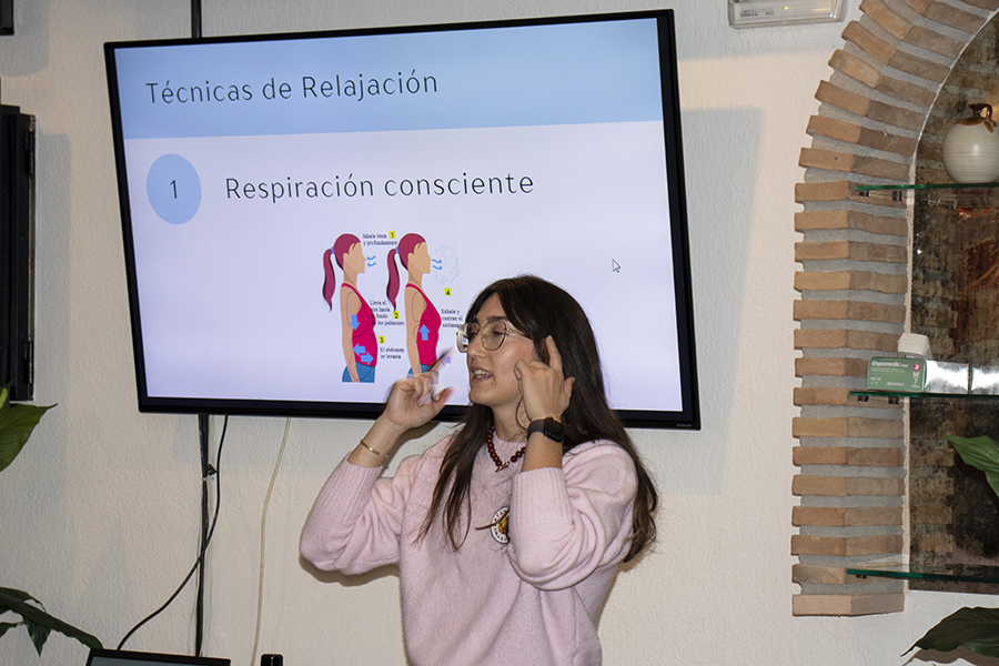 También se realizó un ejercicio de respiración, colocando una mano en el pecho y otra en el abdomen, para practicar una respiración más pausada y favorecer la relajación.